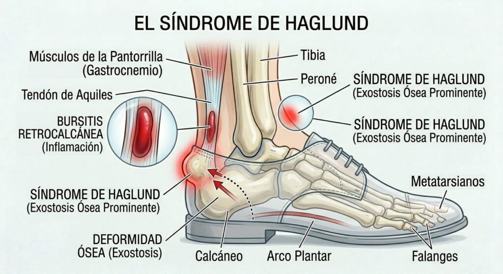 - El síndrome de Haglund: también conocido como «protuberancia del talón» o «bulto de bailarina», es una condición médica que se caracteriza por la presencia de una protuberancia ósea en la parte posterior del talón. Esta protuberancia se forma debido a la irritación crónica del hueso y los tejidos circundantes, generalmente causada por la presión y la fricción repetida entre el calcáneo y el calzado. Los síntomas comunes del síndrome de Haglund incluyen dolor en la parte posterior del talón, que puede ser intermitente o constante, inflamación y enrojecimiento alrededor del área afectada, sensibilidad al tacto en la protuberancia ósea y dolor y rigidez al caminar, correr o realizar actividades que ejerzan presión sobre el talón. Las causas exactas del síndrome de Haglund no siempre están claras, pero se cree que pueden influir: