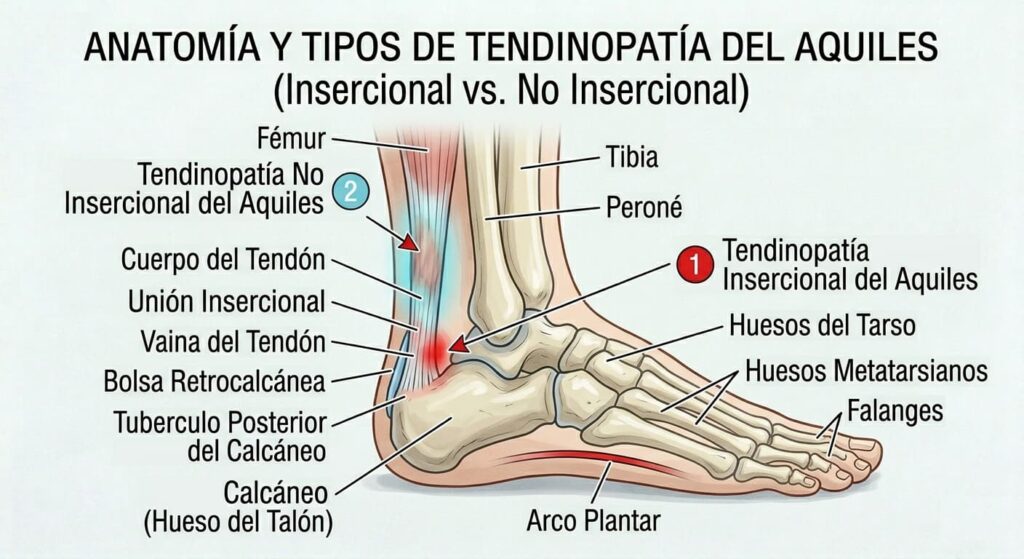- Tendinopatía insercional del Aquiles: ocurre en el punto de unión del tendón de Aquiles al hueso del talón, llamado calcáneo. Conlleva inflamación, degeneración o calcificación en esta zona, lo que resulta en dolor en la parte posterior del talón justo encima del hueso. El tendón se inserta en el talón en forma de abanico y puede haber diferentes puntos de dolor, habitualmente agudo al contacto.