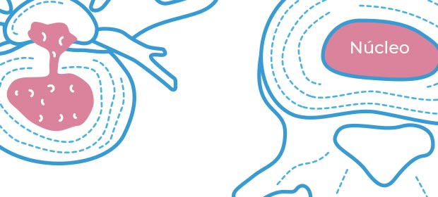 - Prolapso discal: el anillo fibroso tiene daños y el núcleo tiende a extenderse a través de estas lesiones, dando como resultado un abombamiento del disco hacia externo.